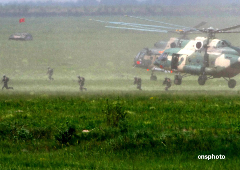中國、俄羅斯兩軍總參謀長,7月23日上午到沈陽軍區(qū)洮南合同戰(zhàn)術(shù)訓(xùn)練基地,觀看“和平使命2009”聯(lián)合反恐軍事演習(xí)。雙方以陸軍和空軍為主,中方參演部隊(duì)包括1個陸軍戰(zhàn)斗群和1個空軍戰(zhàn)斗群。俄方參演兵力包括1個陸軍加強(qiáng)摩步營、1個空降突擊連和部分空軍兵力,雙方投入兵力兩千多人。中新社發(fā) 宋吉河 攝
