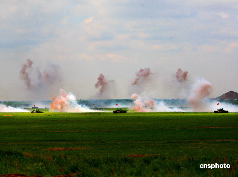中國、俄羅斯兩軍總參謀長,7月23日上午到沈陽軍區(qū)洮南合同戰(zhàn)術訓練基地,觀看“和平使命2009”聯(lián)合反恐軍事演習。雙方以陸軍和空軍為主,中方參演部隊包括1個陸軍戰(zhàn)斗群和1個空軍戰(zhàn)斗群。俄方參演兵力包括1個陸軍加強摩步營、1個空降突擊連和部分空軍兵力,雙方投入兵力兩千多人。中新社發(fā) 宋吉河 攝
