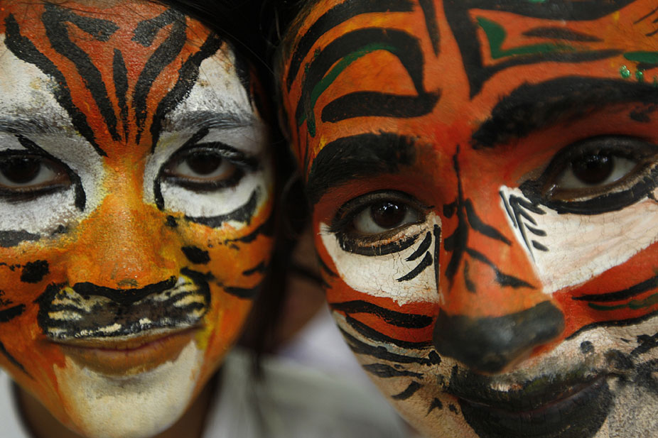 7月28日,約2000名學(xué)生在新德里化妝成老虎的臉譜,圍坐成老虎的造型,與官員和野生動(dòng)物專家們一起呼吁人們保護(hù)孟加拉虎和其他野生動(dòng)物。