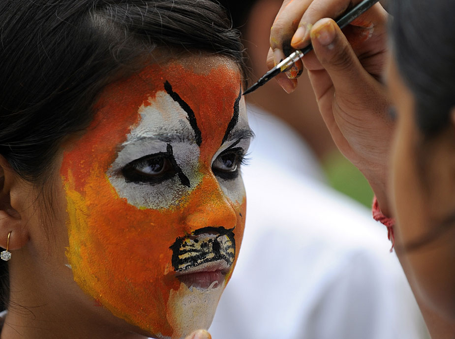 7月28日,約2000名學生在新德里化妝成老虎的臉譜,圍坐成老虎的造型,與官員和野生動物專家們一起呼吁人們保護孟加拉虎和其他野生動物。