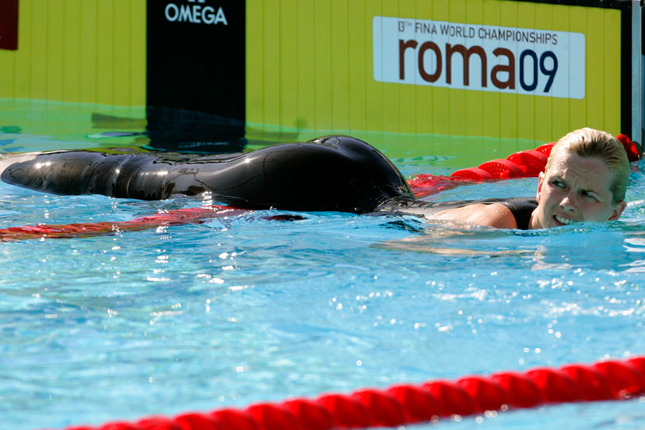 “有腳的美人魚”——7月30日,布麗塔·斯特芬在女子100米自由泳預賽后橫跨泳道線秀美臀。