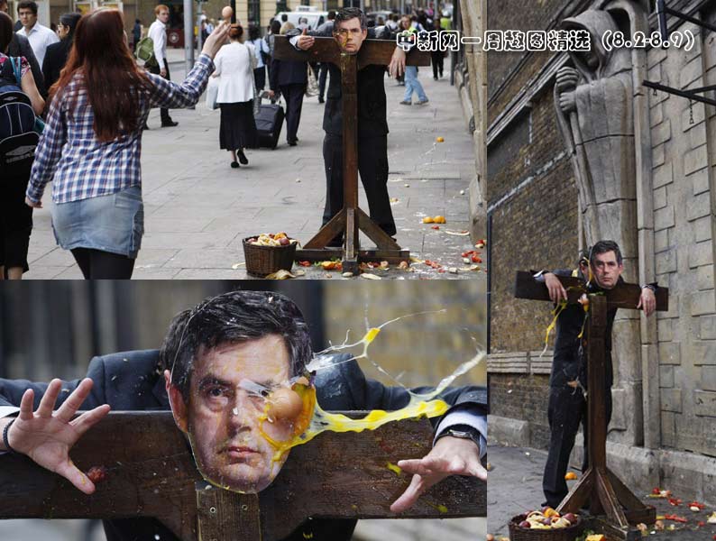 8月6日,英國(guó)倫敦,英國(guó)首相布朗的頭像被安放在街頭的一處“斷頭臺(tái)”上,被過(guò)往的行人用雞蛋砸。點(diǎn)擊觀看詳細(xì)內(nèi)容