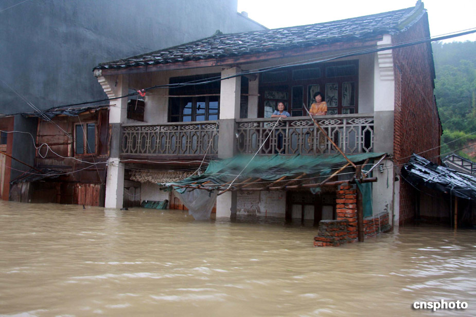 八月九日,受臺風(fēng)“莫拉克”強(qiáng)降雨的影響,福建寧德福鼎南墘村大面積受淹,大水同時也將通往該村的道路全部淹沒,致使該村猶如“孤島”,該村近三百名村民被困。中新社發(fā) 彭登筍 攝
