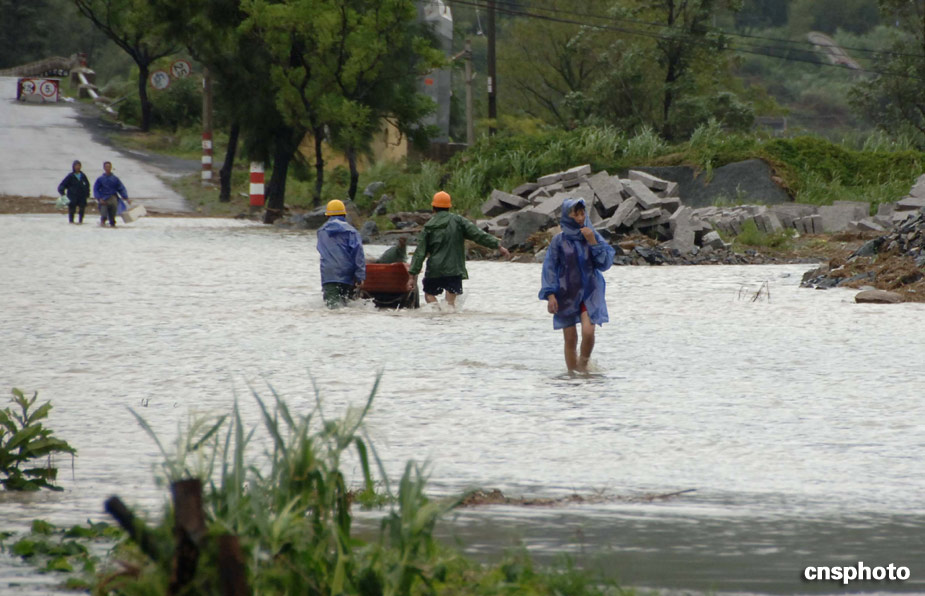 8月9日16時(shí)20分,第8號(hào)臺(tái)風(fēng)“莫拉克”在福建省霞浦縣沿海登陸,登陸時(shí)臺(tái)風(fēng)中心最大風(fēng)速12級(jí)(33米/秒),中心氣壓970百帕!澳恕睅淼膹(qiáng)降雨致使福建霞浦許多路段被淹。中新社發(fā) 王東明 攝