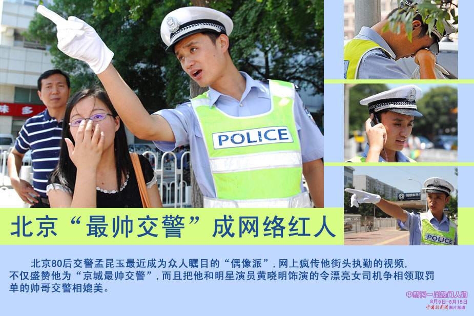 中新網(wǎng)本周熱點人物之最帥交警——1981年出生的孟昆玉因兢兢業(yè)業(yè)地在崗位上奉獻八年,公正執(zhí)法、悉心為民服務(wù)。被網(wǎng)友捧為“北京最帥交警”。