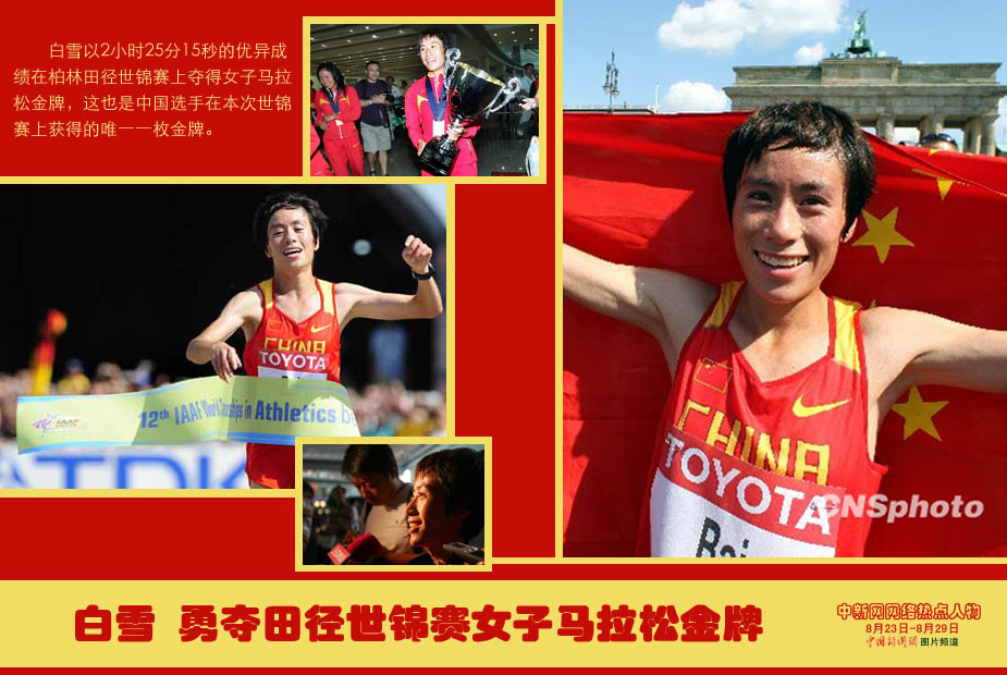 中新網(wǎng)本周熱點(diǎn)人物之——白雪 白雪以2小時(shí)25分15秒的優(yōu)異成績(jī)?cè)诎亓痔飶绞厘\賽上奪得女子馬拉松金牌,這也是中國(guó)選手在本次世錦賽上獲得的唯一一枚金牌。