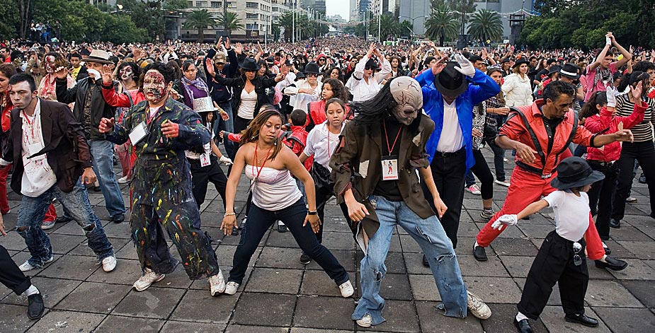 8月29日,逾萬名墨西哥人在墨西哥城廣場同時(shí)跳舞,用以紀(jì)念邁克爾·杰克遜第51個(gè)“生日”,同時(shí)也試圖打破同時(shí)跳舞人數(shù)最的吉尼斯世界紀(jì)錄。圖片來源:中國新聞網(wǎng)