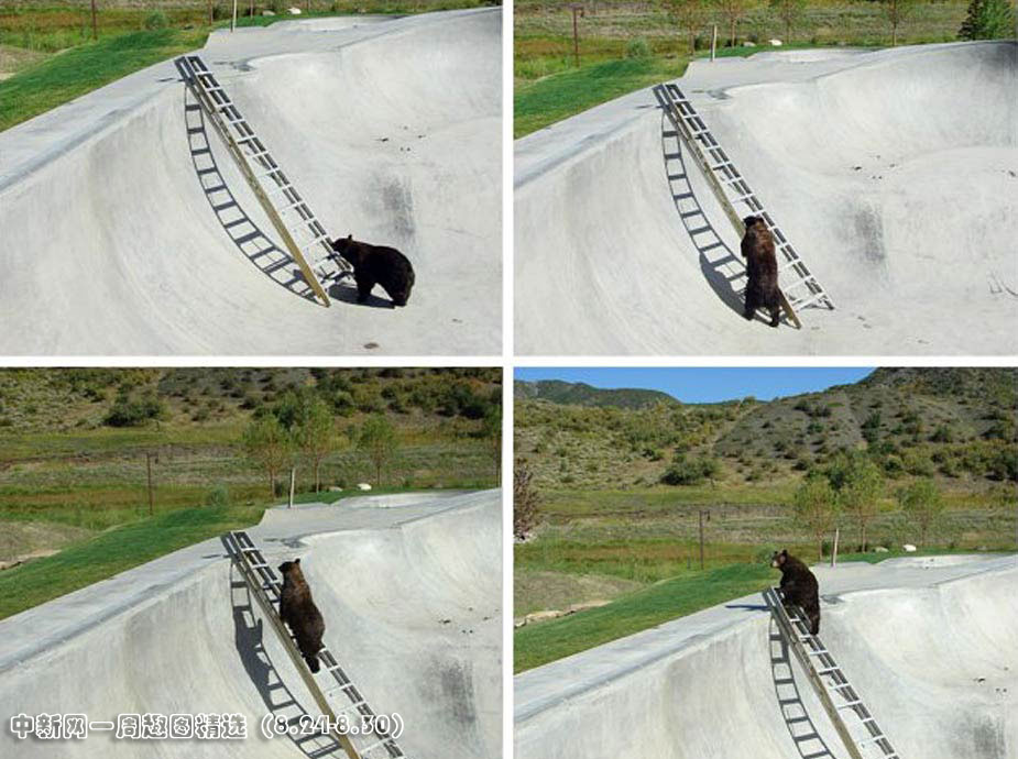 8月25日,美國科羅拉多州一只被困滑板池的狗熊成功爬梯逃生,在監(jiān)控器前上演了一出“狗熊版越獄”。圖片來源:中國新聞網