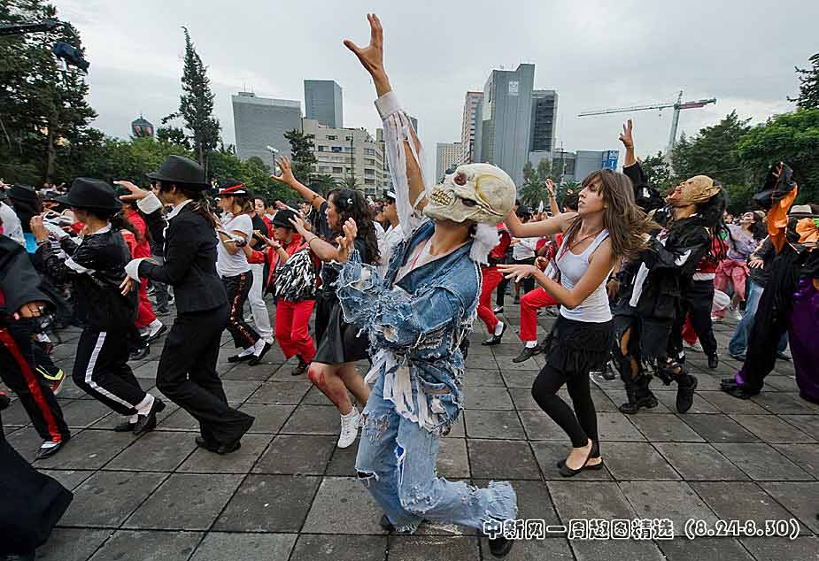 逾萬(wàn)名墨西哥人在墨西哥城廣場(chǎng)同時(shí)跳舞,用以紀(jì)念邁克爾·杰克遜第51個(gè)“生日”,同時(shí)也試圖打破同時(shí)跳舞人數(shù)最的吉尼斯世界紀(jì)錄。圖片來(lái)源:中國(guó)新聞網(wǎng)