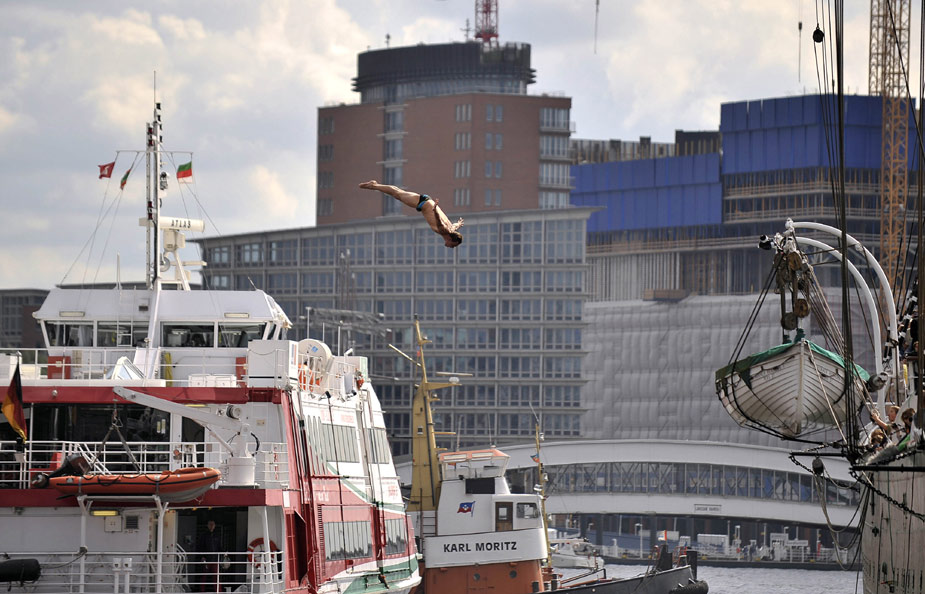 當(dāng)?shù)貢r(shí)間8月29日,世界懸崖跳水系列賽在德國漢堡舉行。圖片來源:中國新聞網(wǎng)