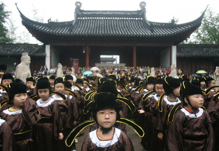 2009年8月31日,南京夫子廟小學(xué)一年級(jí)新生在南京夫子廟參加了“開筆破蒙”儀式。點(diǎn)朱砂、寫“人”字、念《論語》……接受傳統(tǒng)文化熏陶成為孩子們新學(xué)期的第一課。一年級(jí)新生穿著統(tǒng)一的“祭孔服”,老師們挨個(gè)在孩子們額頭點(diǎn)上朱砂痣,并送上祝福的話。點(diǎn)朱砂,又稱“開天眼”,寓意孩子從此眼明心明,好讀書,讀好書。麥兜/CFP