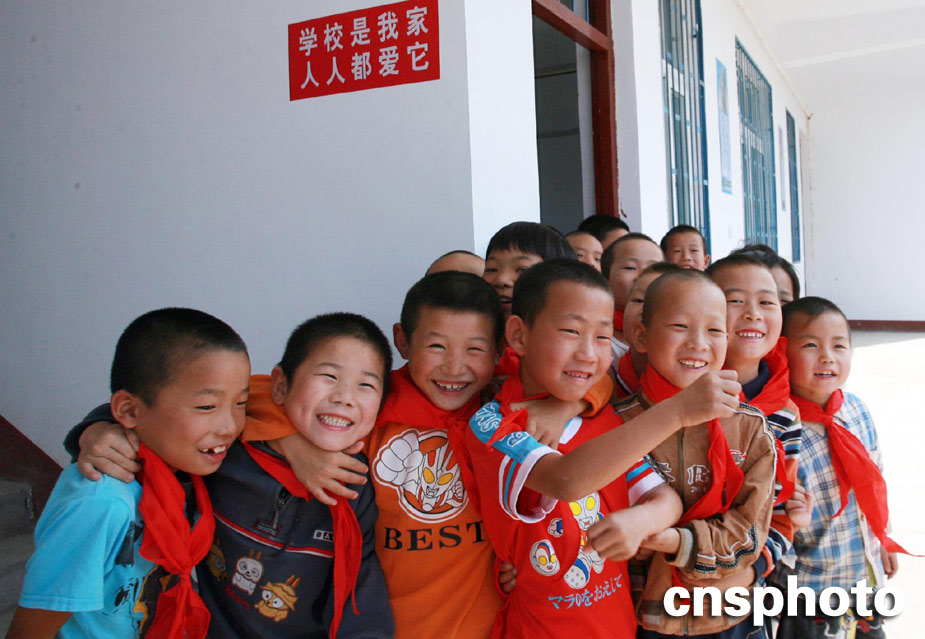 8月31日上午,河南許昌市姬營村,南水北調(diào)移民姬營小學(xué)的小學(xué)生聚集在新落成的教室門口笑逐顏開。當(dāng)日是姬營小學(xué)落成開學(xué)的第一天,該小學(xué)占地5.8畝,擁有740平方米的教學(xué)樓、270平方米的教師辦公室,現(xiàn)有移民新生158人,其中,學(xué)前班47人,一至六年級111人。中新社發(fā) 王中舉 攝