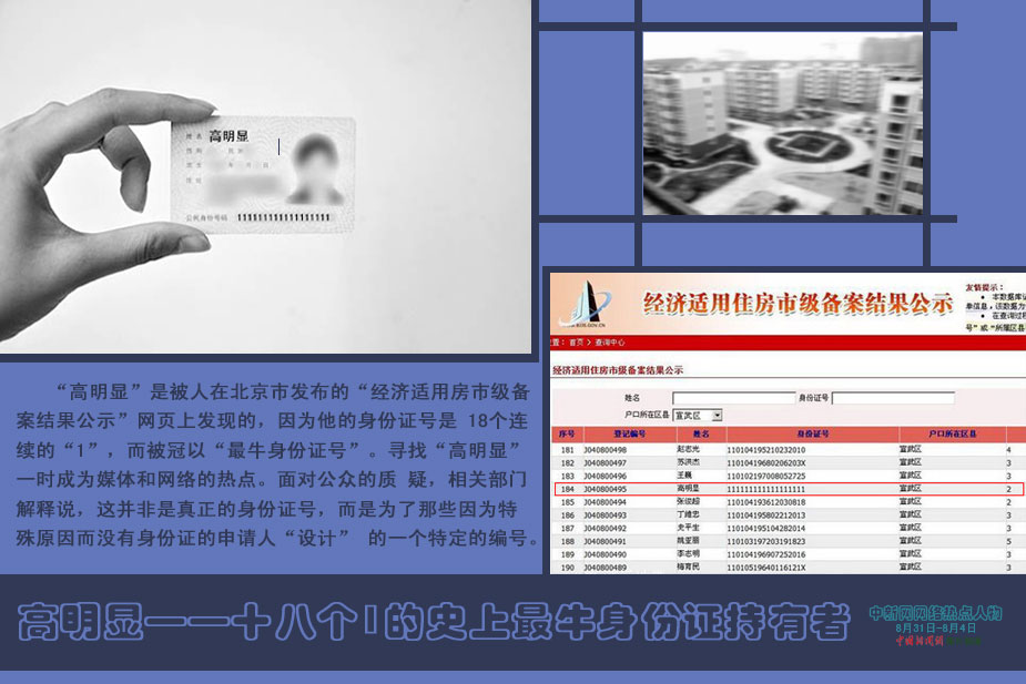 中新網(wǎng)本周熱點(diǎn)人物之——高明顯 “高明顯”是被人在北京市發(fā)布的“經(jīng)濟(jì)適用房市級(jí)備案結(jié)果公示”網(wǎng)頁(yè)上發(fā)現(xiàn)的,因?yàn)樗纳矸葑C號(hào)是 18個(gè)連續(xù)的“1”,而被冠以“最牛身份證號(hào)”。尋找“高明顯”一時(shí)成為媒體和網(wǎng)絡(luò)的熱點(diǎn)。面對(duì)公眾的質(zhì) 疑,相關(guān)部門解釋說(shuō),這并非是真正的身份證號(hào),而是為了那些因?yàn)樘厥庠蚨鴽](méi)有身份證的申請(qǐng)人“設(shè)計(jì)” 的一個(gè)特定的編號(hào)。圖片來(lái)源:中青網(wǎng)、人民網(wǎng)、大河網(wǎng)