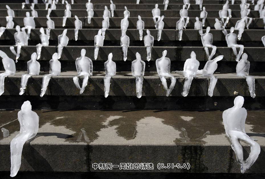 9月2日,德國柏林,世界野生動物基金會(WWF)將1000個小冰人被放置在了御林廣場音樂廳的臺階上,小冰人慢慢融化成水。圖片來源:中國新聞網(wǎng)