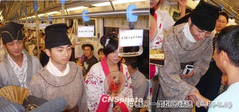 三日上午,三位身著古裝的年輕人在南京地鐵首列品牌列車“人文號(hào)”里,與乘客一起朗誦詩歌、知識(shí)競(jìng)答。圖片來源:中國(guó)新聞網(wǎng)