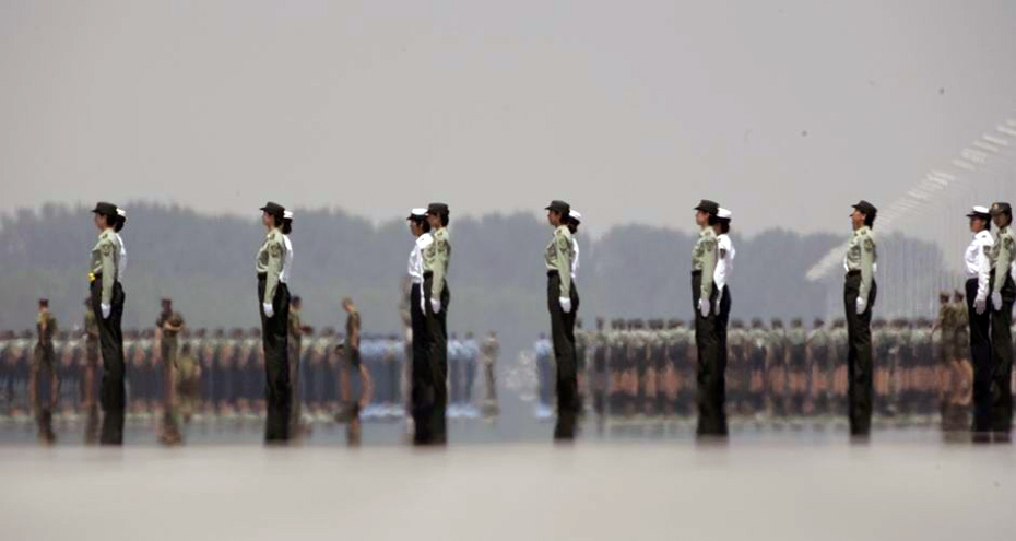 在熱浪中,三軍女兵方隊(duì)在進(jìn)行訓(xùn)練(7月3日攝)。王建民 攝