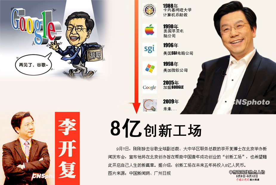 中新網(wǎng)本周熱點(diǎn)人物之——李開復(fù) 剛剛辭去谷歌全球副總裁、大中華區(qū)職務(wù)總裁的李開復(fù)博士在北京舉辦新聞發(fā)布會(huì),宣布他將在北京創(chuàng)辦旨在幫助中國(guó)青年成功創(chuàng)業(yè)的“創(chuàng)新工場(chǎng)”,也希望藉此開啟自己人生的新篇章。據(jù)介紹,創(chuàng)新工場(chǎng)在未來五年將投入8億人民幣。