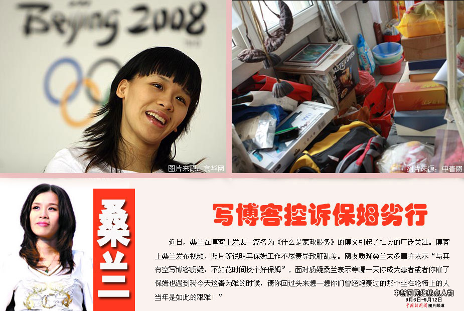 中新網(wǎng)本周熱點(diǎn)人物之——桑蘭 近日,桑蘭在博客上發(fā)表一篇名為《什么是家政服務(wù)》的博文引起了社會(huì)的廣泛關(guān)注。博客上桑蘭發(fā)布視頻、照片等說(shuō)明其保姆工作不盡責(zé)導(dǎo)致臟亂差。有網(wǎng)友質(zhì)疑桑蘭太多事并表示“與其有空寫(xiě)博客質(zhì)疑,不如花時(shí)間找個(gè)好保姆”。面對(duì)質(zhì)疑桑蘭稱“別以為‘輪椅事件’ ‘神醫(yī)門(mén)’‘保姆門(mén)’就認(rèn)為我是個(gè)怨婦或者那么唧唧歪歪。等哪一天你坐上輪椅乘飛機(jī),你成為患者或者你雇了保姆也遇到我今天這番為難的時(shí)候,請(qǐng)你回過(guò)頭來(lái)想一想你們?cè)?jīng)炮轟過(guò)的那個(gè)坐在輪椅上的人當(dāng)年是如此的艱難!”