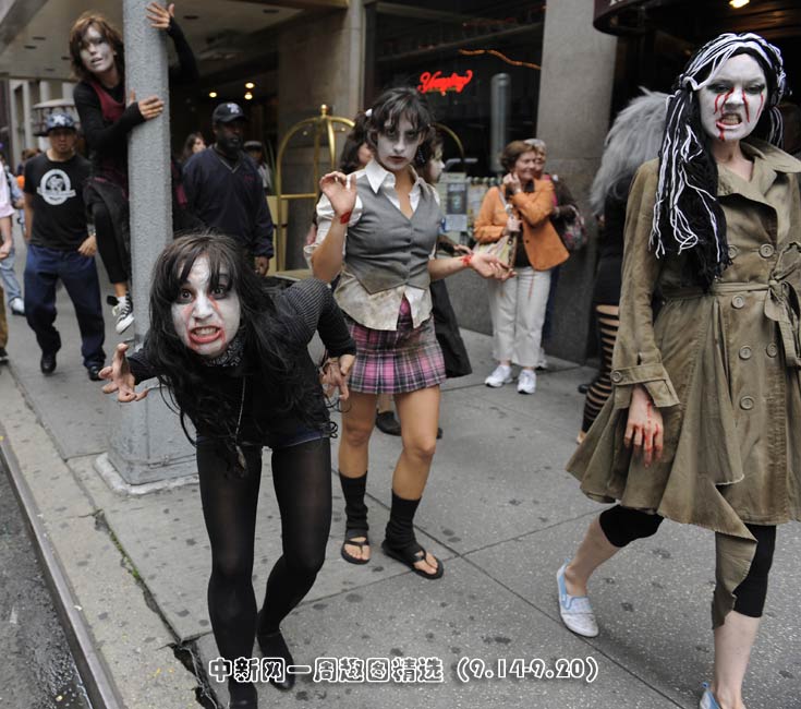 當(dāng)?shù)貢r(shí)間9月16日,在美國(guó)紐約時(shí)代廣場(chǎng),一群演員裝扮成僵尸的樣子,在街頭行走,提前為下個(gè)月到來(lái)的萬(wàn)圣節(jié)造勢(shì)。圖片來(lái)源:中國(guó)新聞網(wǎng)