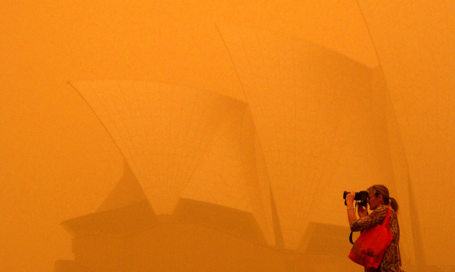 澳大利亞悉尼23日出現(xiàn)罕見(jiàn)的沙塵暴,加上風(fēng)速每小時(shí)上百公里的強(qiáng)風(fēng)吹襲,全城籠罩在一片橘紅色的塵霧中,由于能見(jiàn)度相當(dāng)?shù)停w機(jī)和渡輪暫時(shí)停飛或停駛。