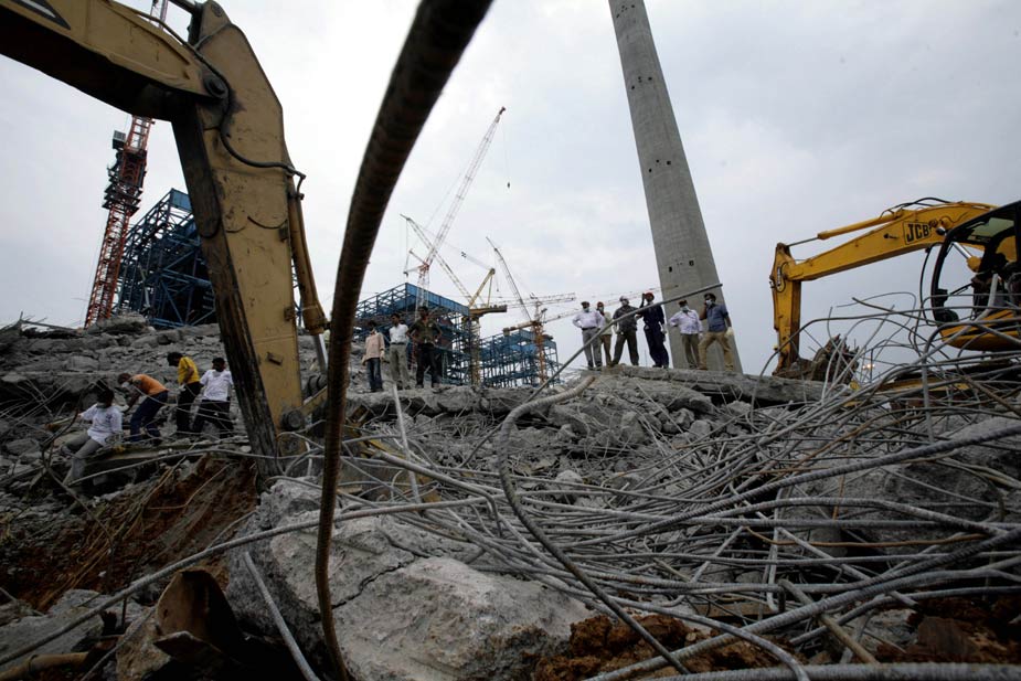 印度中部一座在建電廠的巨型煙囪23日下午發(fā)生倒塌,目前估計(jì)已有至少100人罹難。圖片來源:中國新聞網(wǎng)