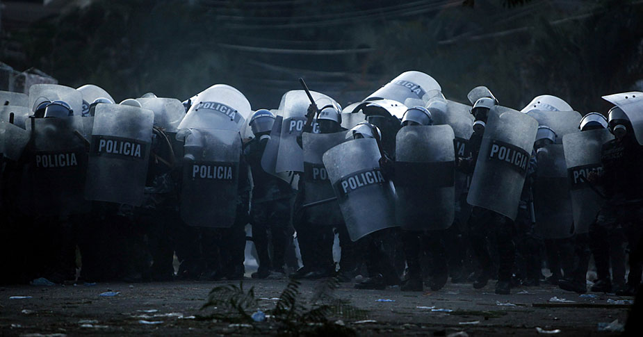 22日,在洪都拉斯首都特古西加爾巴的巴西大使館外,防暴警察與被逐總統(tǒng)塞拉亞的支持者發(fā)生沖突。圖片來(lái)源:中國(guó)新聞網(wǎng)