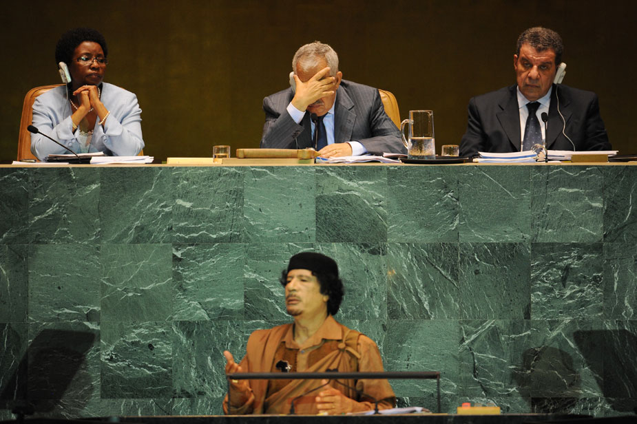 執(zhí)政40年來首次在聯(lián)合國亮相的利比亞領(lǐng)導(dǎo)人卡扎菲,23日在聯(lián)大一般性辯論上發(fā)表演講,強力攻擊安理會和聯(lián)合國的現(xiàn)有體制,并將原定15分鐘的演講拖到一個半小時,很多國家代表團成員最后堅持不住,紛紛離開會議現(xiàn)場。圖片來源:中國新聞網(wǎng)