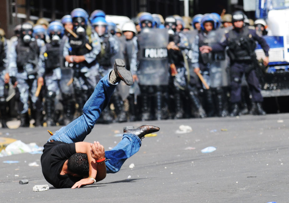 23日,在洪都拉斯首都特古西加爾巴,一名抗議者被警察的橡膠子彈擊中。洪都拉斯警方發(fā)言人奧爾林·塞拉托當日表示,自21日被罷免總統(tǒng)塞拉亞突然回國以來,洪首都特古西加爾巴局部地區(qū)發(fā)生多次騷亂,已經(jīng)造成兩人喪生。圖片來源:中國新聞網(wǎng)