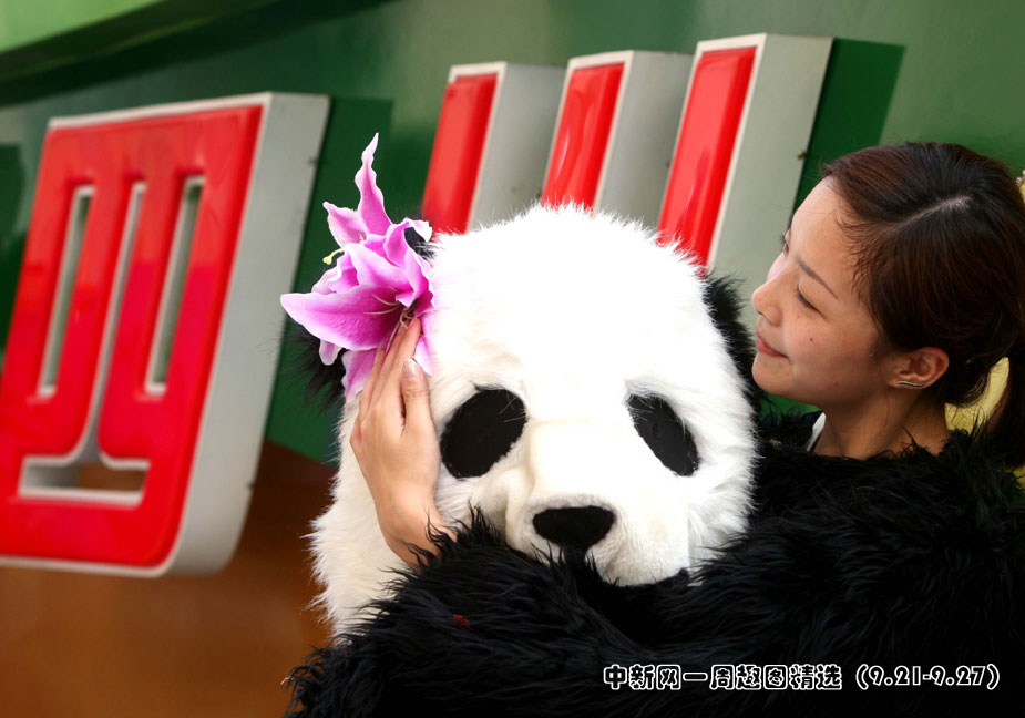 9月24日,來(lái)自四川“奮進(jìn)四川彩車(chē)”的美女演員排練之余精心打扮道具。圖片來(lái)源:中國(guó)新聞網(wǎng)