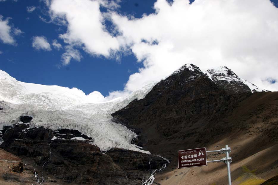 由于長年受公路上的車塵的覆蓋,此冰川整體呈白分層形。山口南面6647米的卡魯峰是年楚河和羊卓雍錯兩大水系的分水嶺,此處雪山高聳,周圍冰川地貌突出,巨大的冰川從山頂一直伸展到離公路只有幾百米的路邊,晶瑩幽藍(lán)的冰川寒氣迫人,加上山峰云霧飄緲,仿佛來到了生命絕跡的天界盡頭。