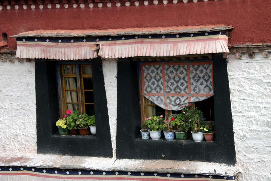 大昭寺里僧舍的窗臺上擺滿了鮮花。