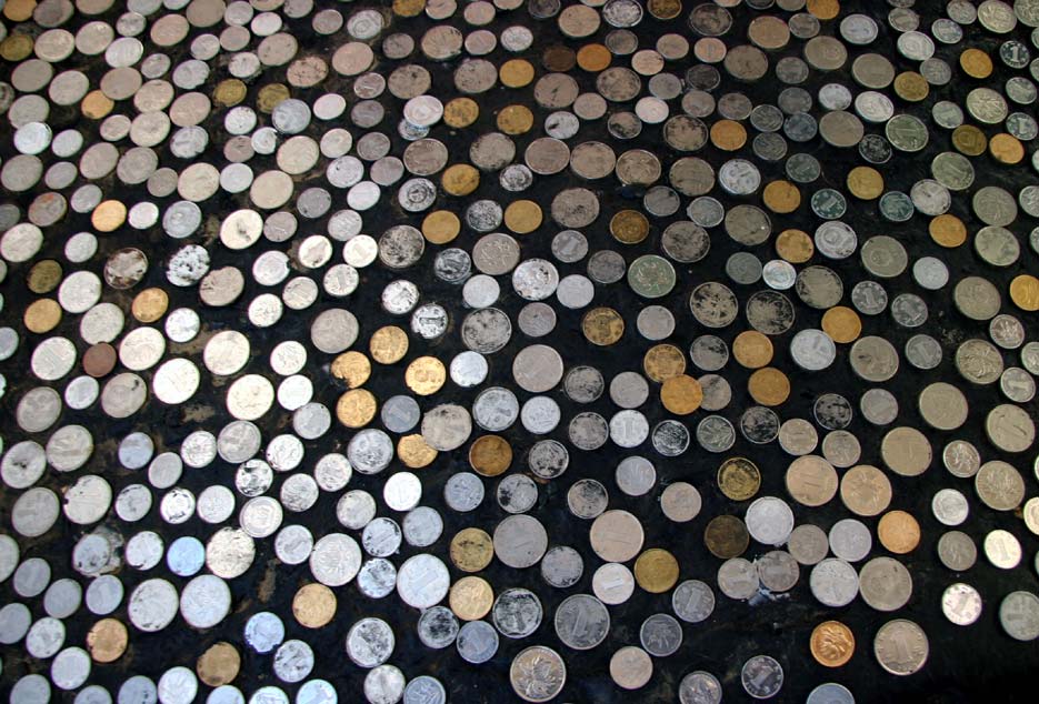 扎什倫布寺里的一處圣跡,即高僧大德觸摸或者蒞臨過的地方。墻上抹過酥油,有了粘性,信徒朝拜路過時會粘貼銀幣于其上,有如在廟堂敬獻(xiàn)錢幣。