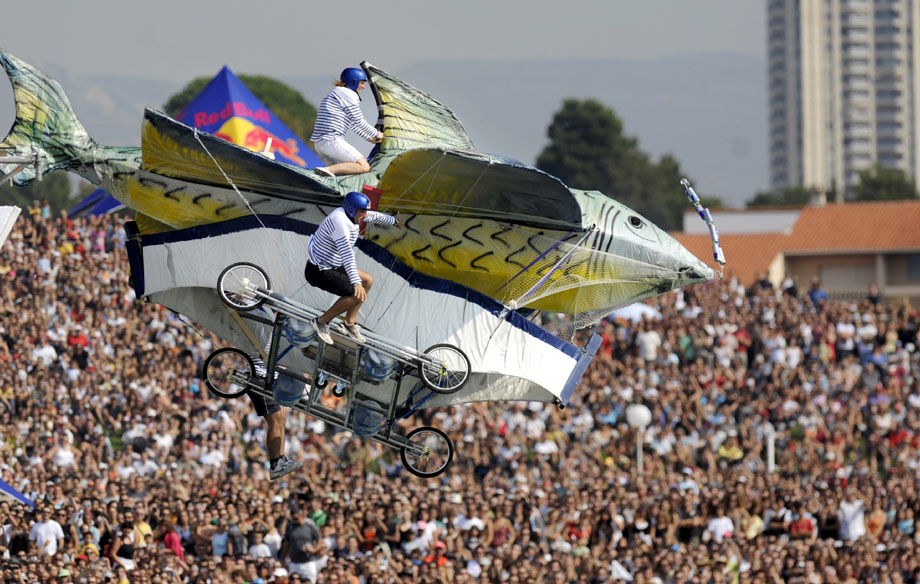 9月27日,法國(guó)馬賽趣味飛行器大賽舉行。比賽規(guī)則簡(jiǎn)單,誰(shuí)能在落水之前飛得更遠(yuǎn)誰(shuí)就是冠軍,但參賽選手絞盡腦汁,把自己的飛行器扮成各種古怪摸樣。圖片來(lái)源:中國(guó)新聞網(wǎng)