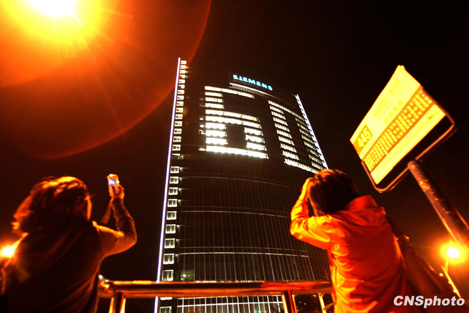 9月28日晚,北京一外企辦公大樓點(diǎn)亮“60”字樣,慶祝新中國成立60周年。中新社發(fā) 張宇 攝