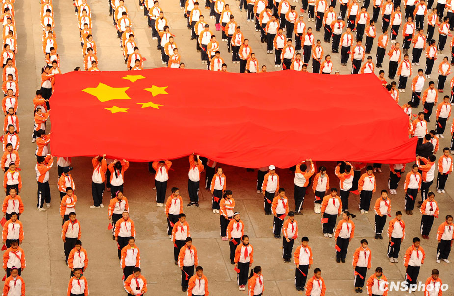 9月28日,黑河市第六小學(xué)舉行“同升一面旗 共愛一個(gè)家”活動(dòng),迎接中華人民共和國成立六十周年。儀式上,黑河市第六小學(xué)學(xué)生傳統(tǒng)師生親自縫制的70平方米的五星紅旗,并在國旗下朗誦《我愛你我的祖國》,共同祝福祖國的明天更美好。中新社發(fā) 邱齊龍 攝