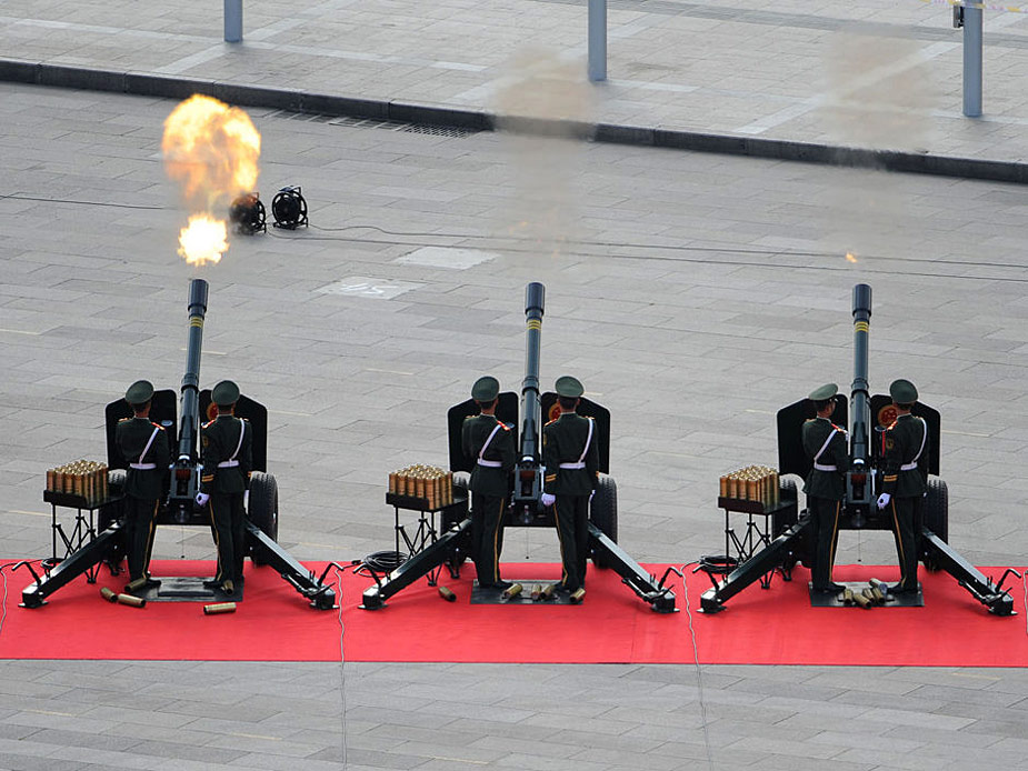 2009年10月1日,中華人民共和國(guó)成立60周年慶祝大會(huì)在北京天安門廣場(chǎng)舉行。圖為國(guó)慶慶典禮炮在天安門廣場(chǎng)鳴響。圖片來(lái)源:新華網(wǎng) 任勇 攝