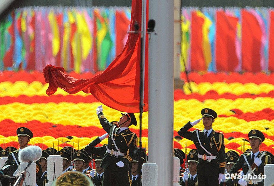 2009年10月1日,中華人民共和國成立60周年慶祝大會(huì)在北京天安門廣場(chǎng)舉行。圖為升旗儀式。中新社發(fā) 廖攀 攝