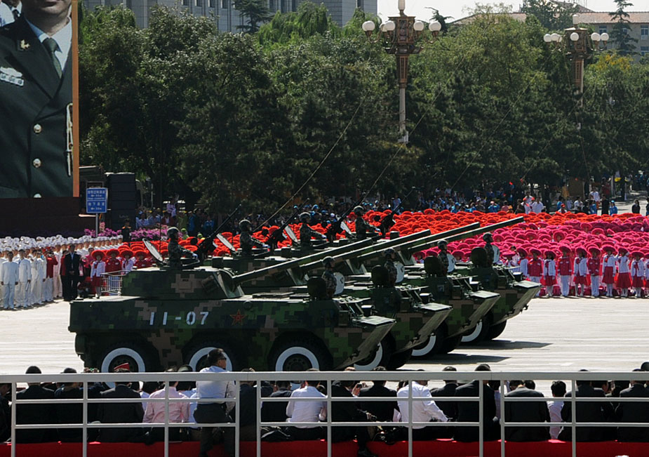 2009年10月1日,中華人民共和國(guó)成立60周年慶祝大會(huì)在北京天安門(mén)廣場(chǎng)舉行。圖為輪式自行迫榴炮方隊(duì)。中新網(wǎng)記者 攝