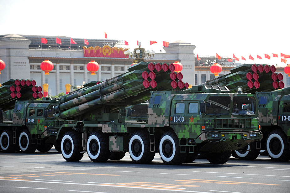 2009年10月1日,中華人民共和國(guó)成立60周年慶祝大會(huì)在北京天安門廣場(chǎng)舉行。圖為遠(yuǎn)程火箭炮方隊(duì)。