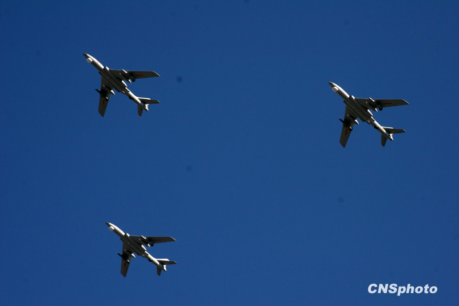 2009年10月1日,中華人民共和國(guó)成立60周年慶祝大會(huì)在北京天安門廣場(chǎng)舉行。圖為轟炸機(jī)梯隊(duì)飛過(guò)天安門廣場(chǎng)上空。中新社發(fā) 郭國(guó)權(quán) 攝