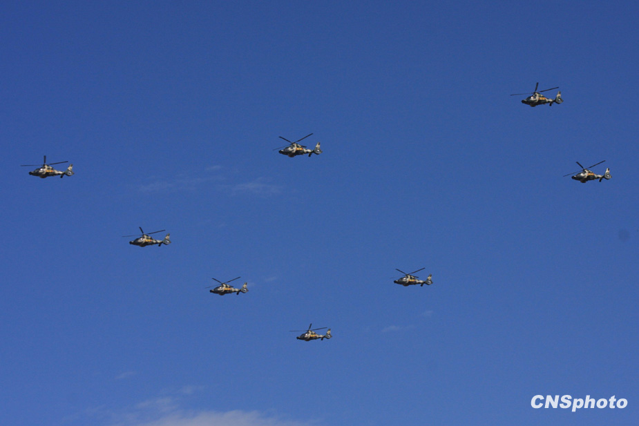2009年10月1日,中華人民共和國成立60周年慶祝大會在北京天安門廣場舉行。偵察直升機梯隊。中新社發(fā) 郭國權(quán) 攝