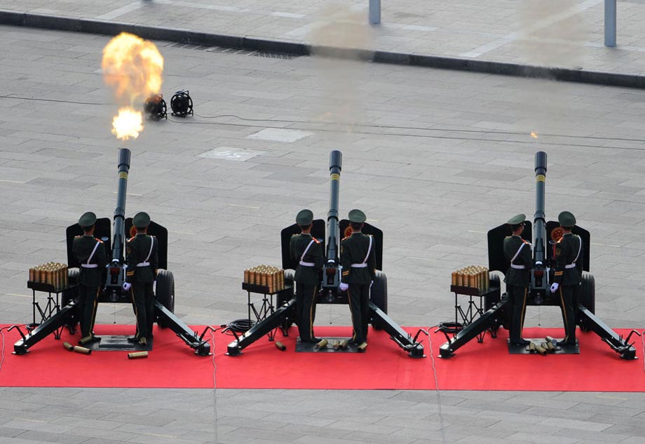 2009年10月1日,中華人民共和國成立60周年慶祝大會在北京天安門廣場舉行。圖為國慶慶典禮炮在天安門廣場鳴響。圖片來源:新華網(wǎng) 任勇 攝