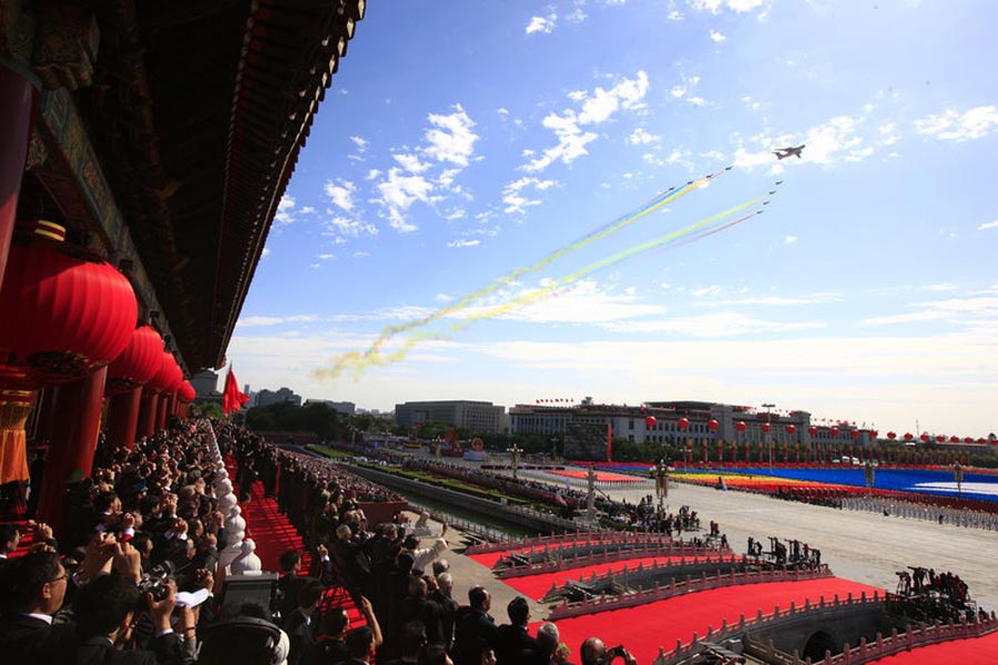 2009年10月1日,首都各界慶祝中華人民共和國(guó)成立60周年大會(huì)在北京舉行。空中方隊(duì)在北京上空駛過(guò)。