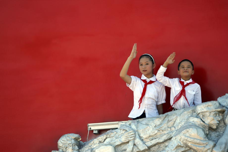 2009年10月1日,首都各界慶祝中華人民共和國成立60周年大會在北京舉行。圖為抗震小英雄林浩在群眾游行的彩車上。