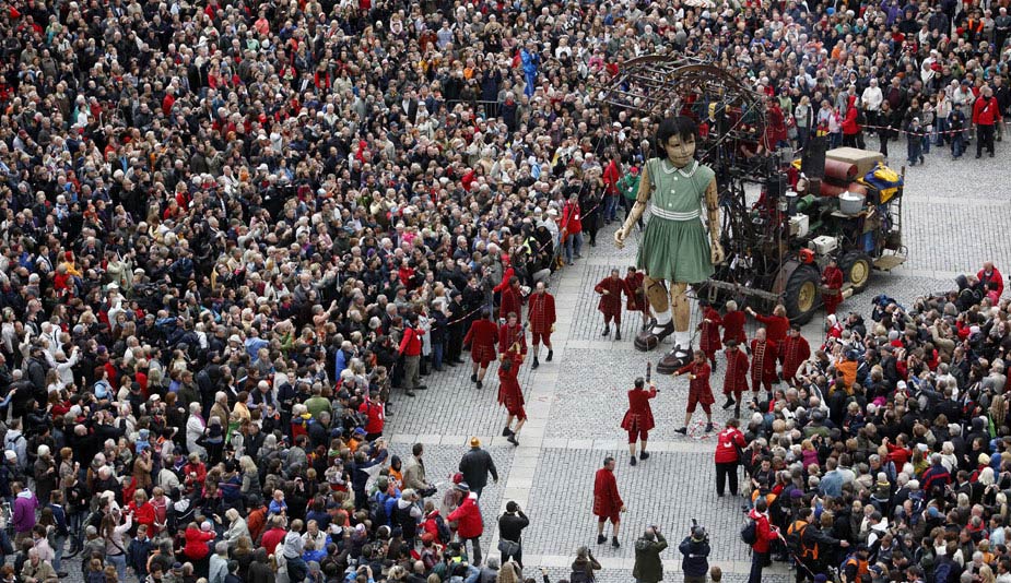 10月2日,來自法國一家戲劇公司的兩個(gè)巨型提線木偶亮相柏林街頭,它們將在露天劇場進(jìn)行表演,以此紀(jì)念柏林墻推倒20周年。圖片來源:中國新聞網(wǎng)