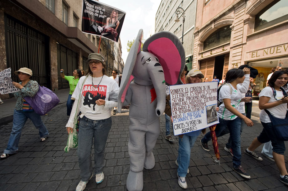 10月4日,在墨西哥首都墨西哥城,參加世界動物日活動的人們頭帶面具,手舉圖片,呼吁人們關(guān)注動物權(quán)益。來源:中國新聞網(wǎng)
