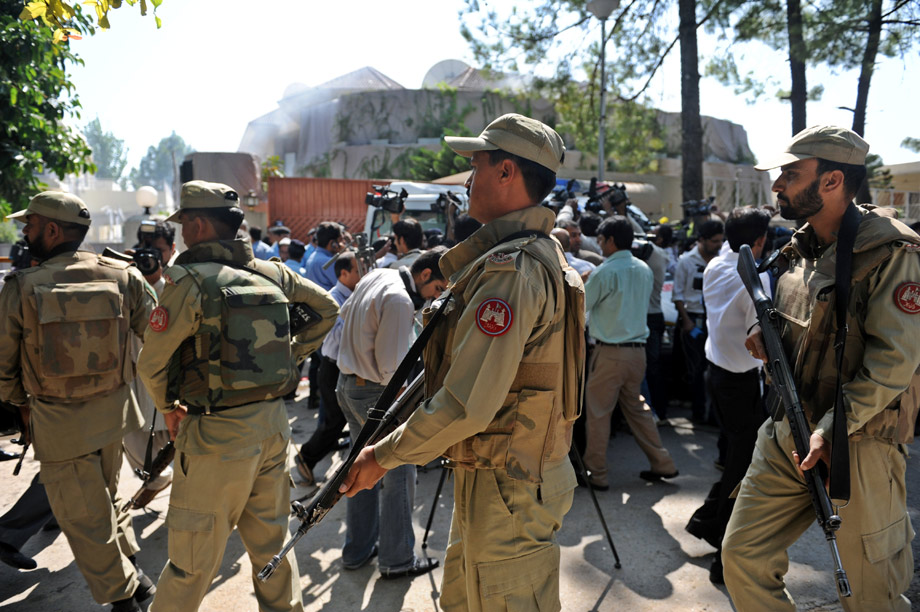 中新網(wǎng)10月5日電 據(jù)法新社報(bào)道,聯(lián)合國(guó)位于巴基斯坦伊斯蘭堡的辦公樓內(nèi)5日發(fā)生自殺式襲擊爆炸,導(dǎo)致3人死亡。報(bào)道稱,當(dāng)時(shí)有80人在該辦公樓工作,遇害者中包括一名外國(guó)人,另外2人是巴基斯坦婦女。還有6名傷者被送往醫(yī)院。圖為安全人員在發(fā)生爆炸的辦公室附近警戒。