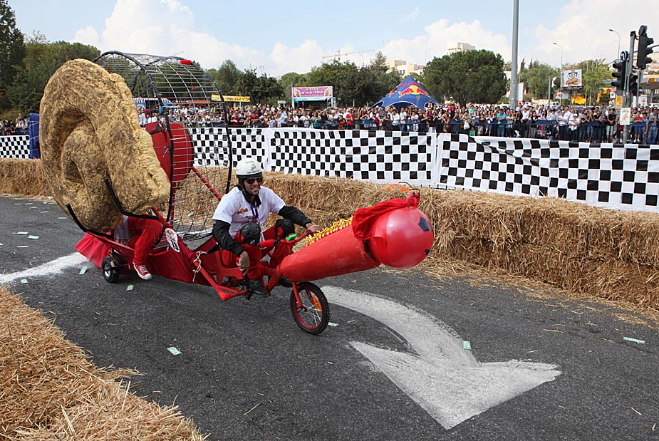 50輛“肥皂盒車”10月7日參加了耶路撒冷舉行的“肥皂盒車”趣味競(jìng)賽。賽道設(shè)置在市中心一條大街的一段斜坡上,比賽者駕駛各種千奇百怪的賽車從起點(diǎn)一路滑下。圖片來源:中國(guó)新聞網(wǎng)