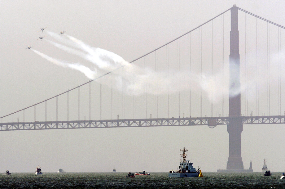 2009年10月8日,美軍飛機(jī)在舊金山灣上空進(jìn)行飛行演練。一年一度的舊金山艦隊(duì)周將于10月10日開幕,屆時會有船艦游行和飛行表演等活動。 來源:中國新聞網(wǎng)