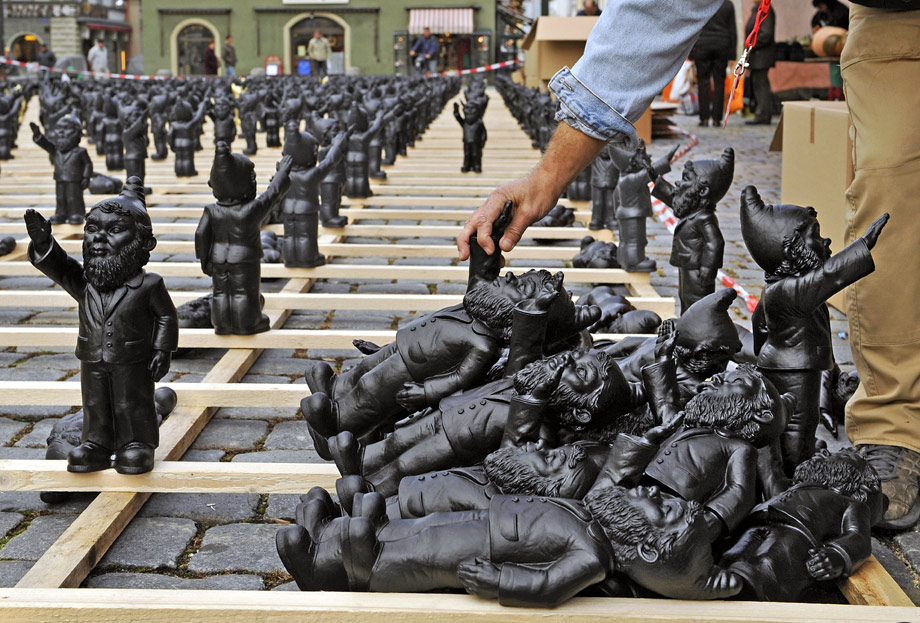 10月14日,德國施特勞賓市街頭擺放了1250個行納粹禮的花園土地神像,“行納粹禮的花園土地神”其實是一款雕塑作品,是由59歲的德國藝術家奧特馬爾·赫勒爾創(chuàng)作的目的在于提醒人們警惕法西斯思想,反對使用法西斯思想控制大眾。